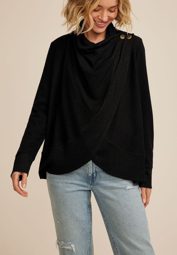 - overlapping front creates a draped, asymmetrical hemline for a modern silhouette