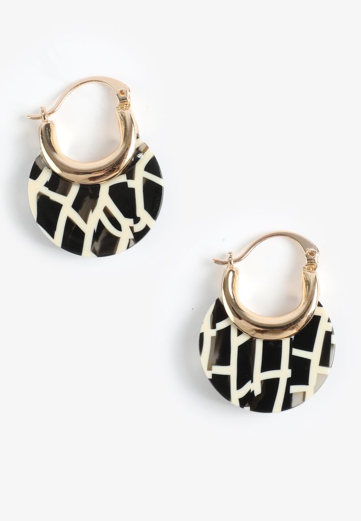a striking mix of modern pattern and polished shine, these hoops blend bold black‑and‑ivory graphics with warm gold tones. the lightweight drop design brings easy movement and just the right pop of statement to elevate everyday looks.