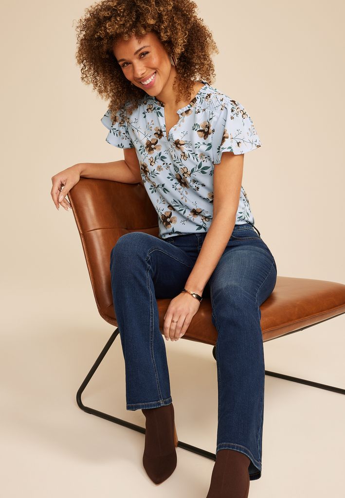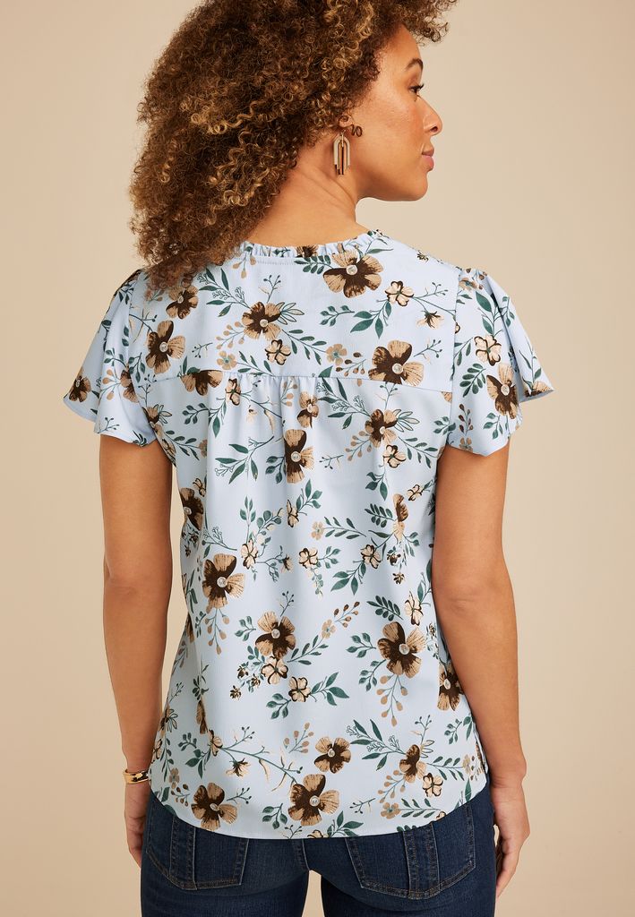 Breeze through your day in this Blue Floral Smocked Shoulder Flutter Sleeve Blouse With its delicate leaf print and airy flutter sleeves, this top brings effortless elegance to any look. Smocked shoulders add a hint of texture, while the split V-neckline flatters with ease. Whether you’re dressing it up for the office or keeping it casual for brunch, this blouse is your go-to for polished comfort.