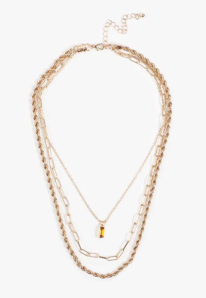 - featuring: thin cable chain with a small rectangular brown gemstone pendant, elongated paperclip-style link chain, twisted rope chain
