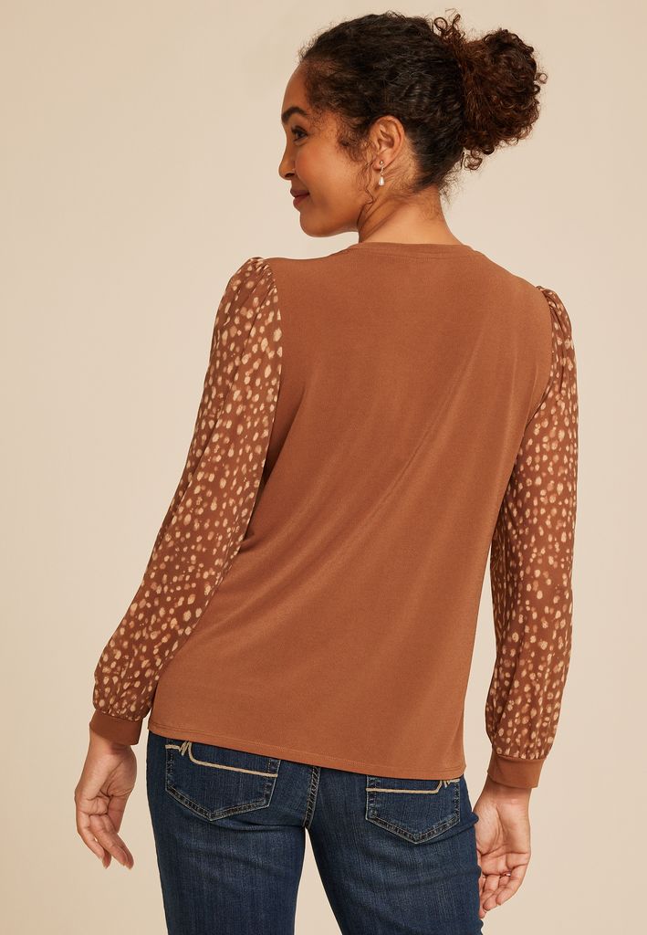 Brown Printed Mesh Puff Sleeves Top