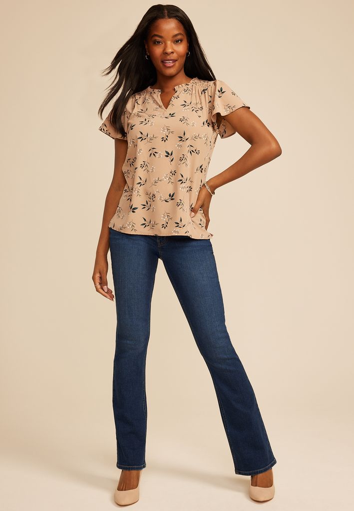 Breeze through your day in this Floral Smocked Shoulder Flutter Sleeve Blouse With its delicate leaf print and airy flutter sleeves, this top brings effortless elegance to any look. Smocked shoulders add a hint of texture, while the split V-neckline flatters with ease. Whether you’re dressing it up for the office or keeping it casual for brunch, this blouse is your go-to for polished comfort.