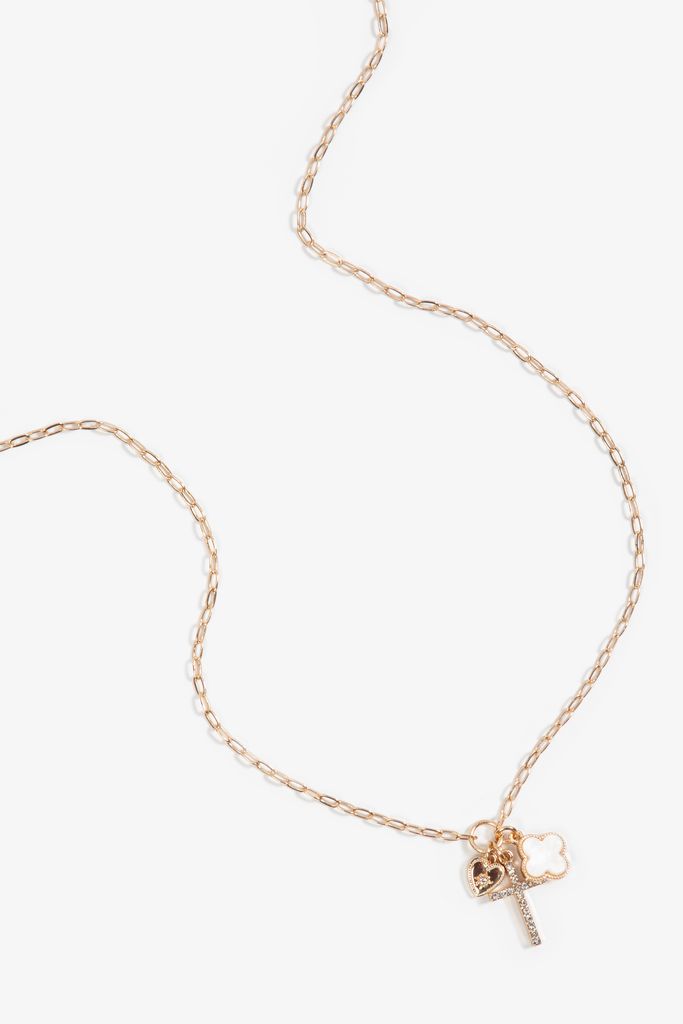 - cross charm with rhinestone accents, heart charm with rhinestone detail, clover charm with white enamel finish