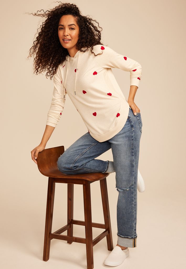 Wrap yourself in a haven of love. This cozy knit hoodie is sprinkled with charming red hearts, creating a look that feels effortlessly sweet. Its soft neutral tone makes it versatile for layering. Perfect for lounging in comfort or styling for a casual day out—because love looks good on you.”