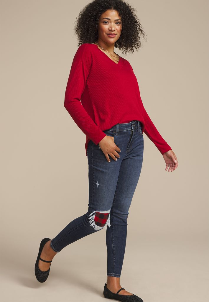 • ripped knee with red and black buffalo plaid patch underneath