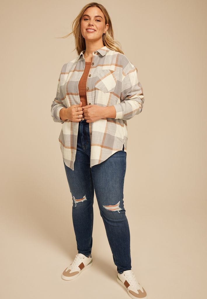 Plus Size Cabin Plaid Boyfriend Tunic Button Down Shirt