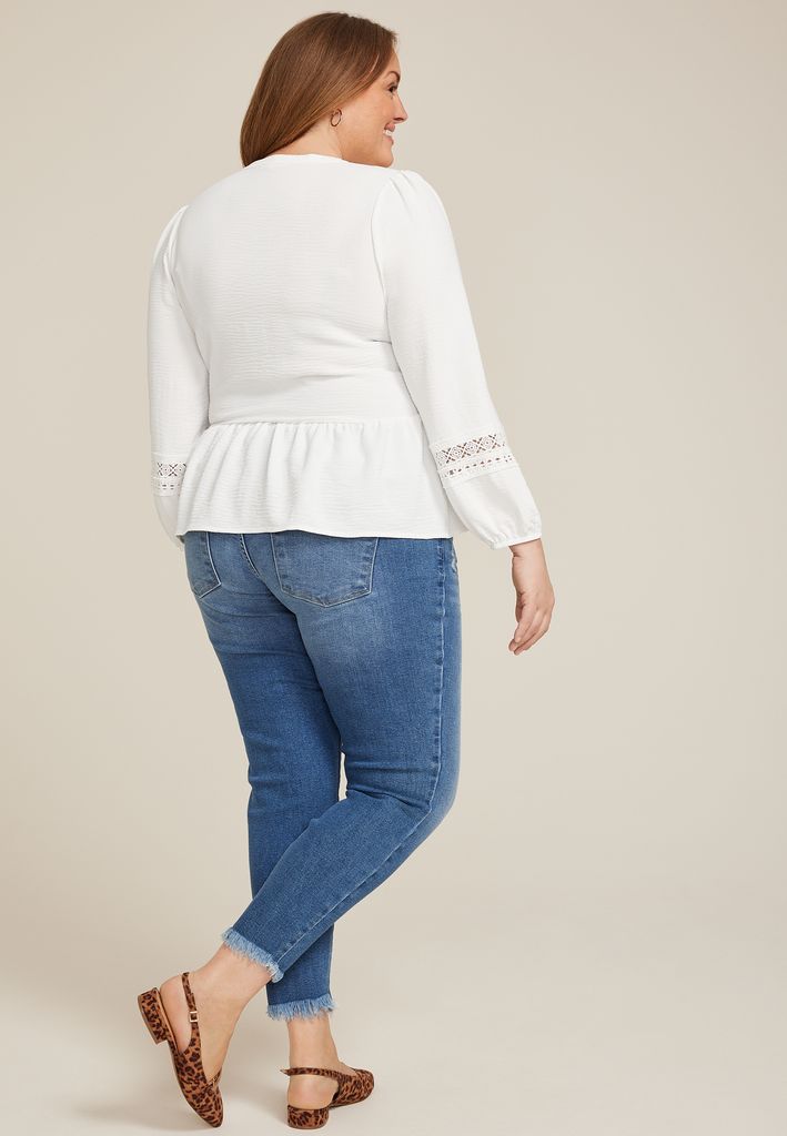 Plus Size Soft White Crochet Trim Tie Front Peplum Top