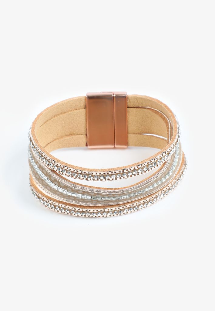 - soft faux suede detail with accented with a blend of rose gold details and rhinestones