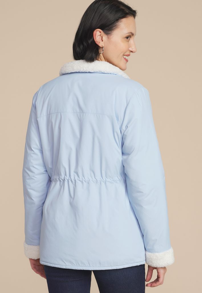 • faux sherpa trim across the chest for added style