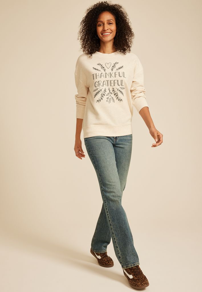 - “THANKFUL GRATEFUL” leaves, branches, berries embroidered detail