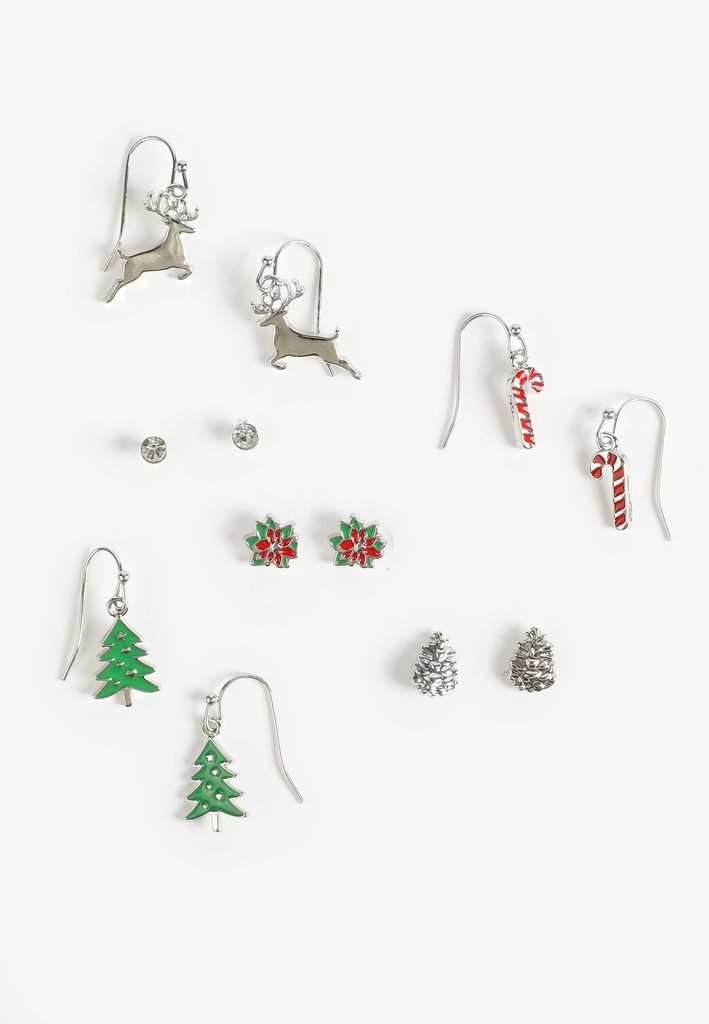 - reindeer drop earrings: silvertone, candy cane drop earrings red and white enamel, Christmas tree drop earrings green enamel, crystal stud earrings clear round stones, poinsettia stud earrings red and green enamel floral design, pinecone stud earrings silvertone textured pinecones