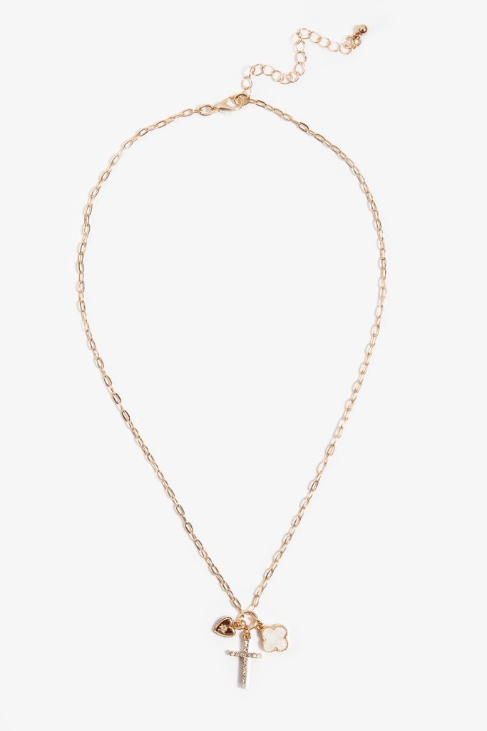 - cross charm with rhinestone accents, heart charm with rhinestone detail, clover charm with white enamel finish