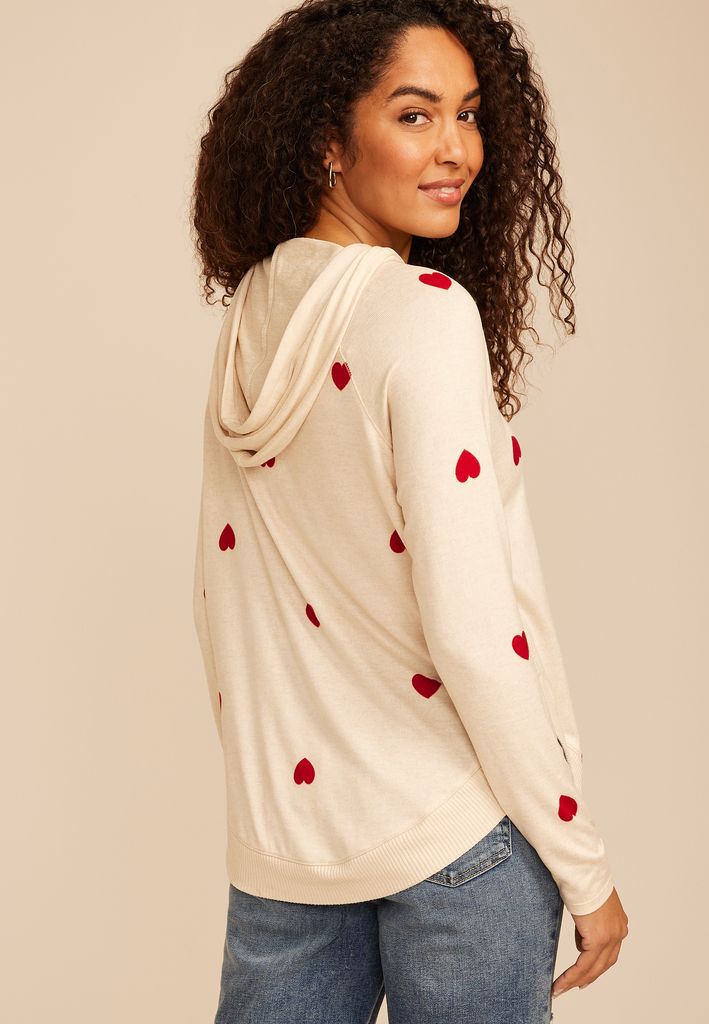 Wrap yourself in a haven of love. This cozy knit hoodie is sprinkled with charming red hearts, creating a look that feels effortlessly sweet. Its soft neutral tone makes it versatile for layering. Perfect for lounging in comfort or styling for a casual day out—because love looks good on you.”