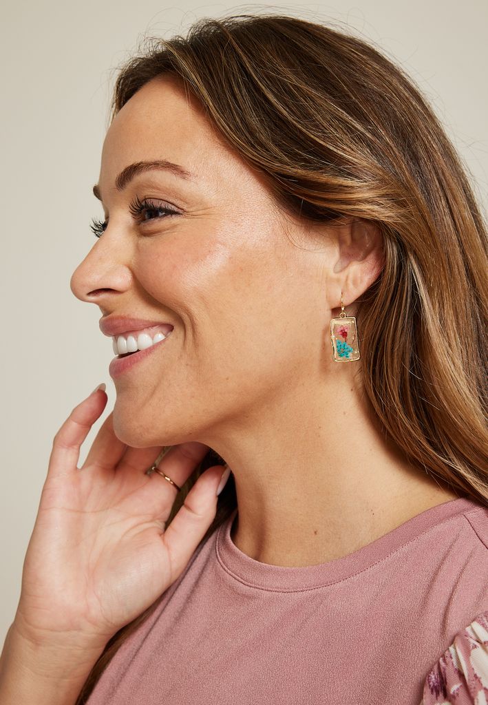 - faux pearl, gold foil, pink and turquoise pressed flower pendant with gold frame detail