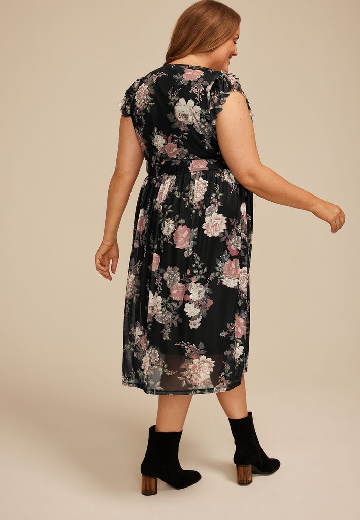 Plus Size Floral Mesh Flutter Sleeve Midi Dress